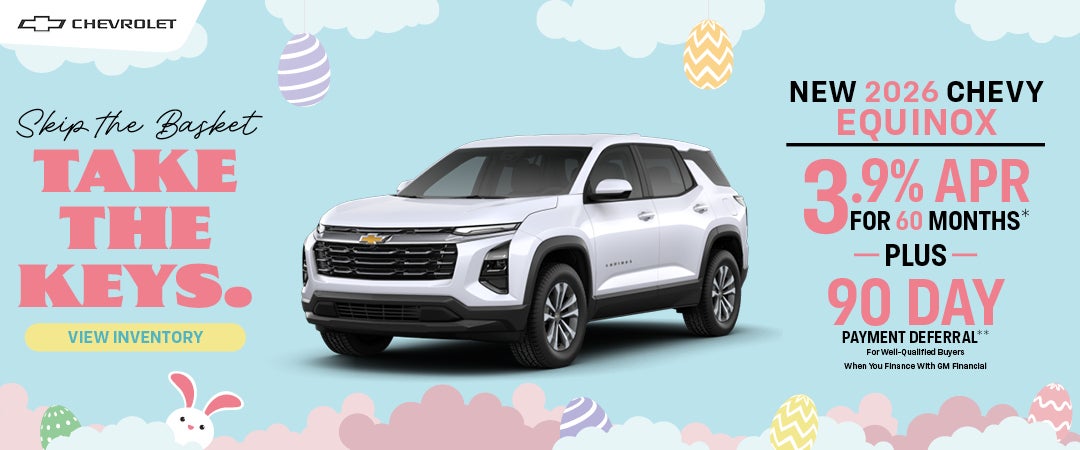 *3.9% APR for 60 months for well-qualified buyers when financed w/GM Financial. Monthly payment is $18.37 for every $1,000 you finance. Example down payment: 16.8%. Not all buyers will qualify. **Deferred monthly payments for 90 days. Finance charges accrue from date of financing. Must finance with GM Financial. Down payment required at signing, if applicable. Some customers may not qualify. Not available with lease and some other offers. Not available with leases and some other offers. Must take new retail delivery by 04/30/2026.