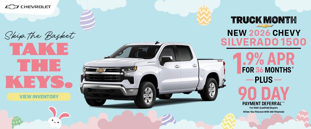 *1.9% APR for 36 months for well-qualified buyers when financed w/GM Financial. Monthly payment is $28.6 for every $1000 you finance. Average example down payment is 10.0%. Not all buyers will qualify. **Deferred monthly payments for 90 days. Finance charges accrue from date of financing. Must finance with GM Financial. Down payment required at signing, if applicable. Some customers may not qualify. Not available with lease and some other offers. Not available with leases and some other offers. Must take new retail delivery by 04/30/2026.