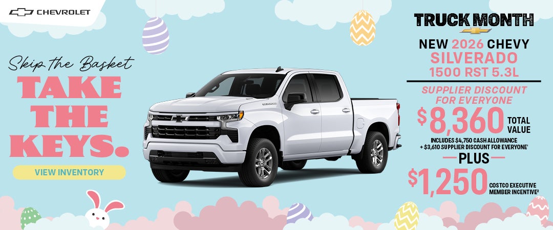 ¹Based on MSRP of $64,031. Offer includes discount below MSRP and cash allowance. Cash allowance not available with lease and some other offers. Supplier pricing available to all customers on select 2026 Silverado 1500 models. Discount equivalent to GM Supplier pricing. Price excludes tax, title, license, and dealer fees. ²To qualify for the GM Limited-Time Special, you must: (1) be a current Costco Member by March 2, 2026; (2) register with Costco Auto Program online or through its call center by April 30, 2026, to receive a certificate with your unique promotion code; (3) present your certificate and unique promotion code to any Chevrolet dealer at time of visit; (4a) take delivery between March 3, 2026, and April 30, 2026, of a new 2025, 2026 Chevrolet Silverado 1500(LD), Silverado 2500/3500(HD), Silverado EV, Colorado or Traverse to receive a $1,000 Non-Executive Costco member-only incentive or $1,250 Executive Costco member-only incentive. (4b) take delivery between March 3, 2026, and April 30, 2026, of a new 2024, 2025 Chevrolet Silverado 4500/5500/6500 or Low Cab Forward to receive a $2,750 Non-Executive Costco member-only incentive or $3,000 Executive Costco member-only incentive. Incentive will be applied at time of eligible purchase or lease and is compatible with current eligible manufacturer incentives for which you qualify. Limit two (2) promotion codes per membership. Incentive is subject to change due to vehicle inventory availability. Visit CostcoAuto.com/GM for full details. Costco and its affiliates do not sell automobiles or negotiate individual transactions. Must take new retail delivery by 04/30/2026.